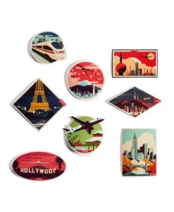 - Vintage-inspired destination stickers included